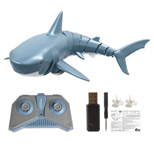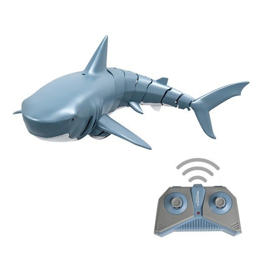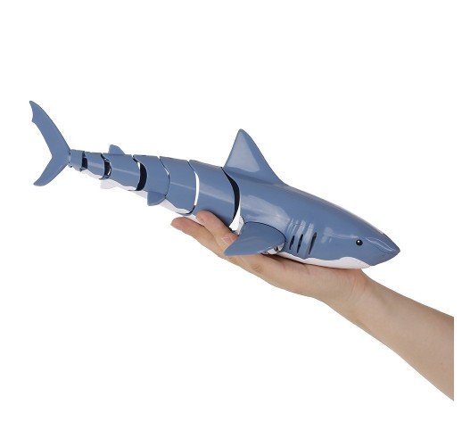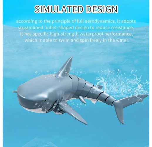 The small-sized RC fish simulates a real shark. It has movable Joints that can make show different paths of activity in the water, swimming faster and more flexible. The 2.4GHz transmitter allows you'll never get any radio interference. The waterproof design makes playing without fear and with more fun.